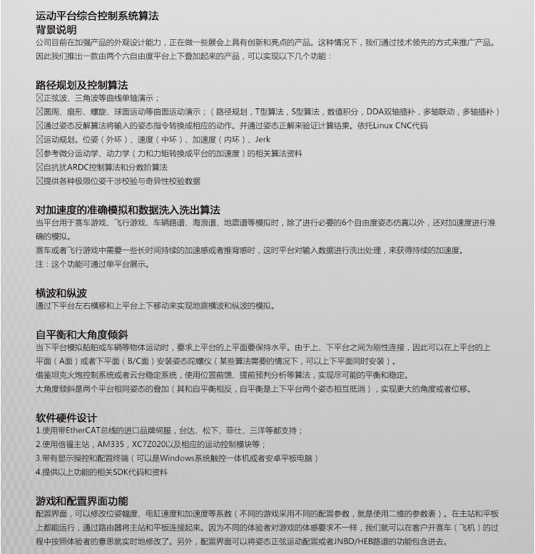 答: 我公司主要從事仿真平臺(tái)、六自由度平臺(tái)和運(yùn)動(dòng)平臺(tái)控制卡的研發(fā)、生產(chǎn)與銷售,同時(shí)承接大型4D/5D/7D影院等工程。專注技術(shù)領(lǐng)先,提升用戶體驗(yàn)是我們的追求!
