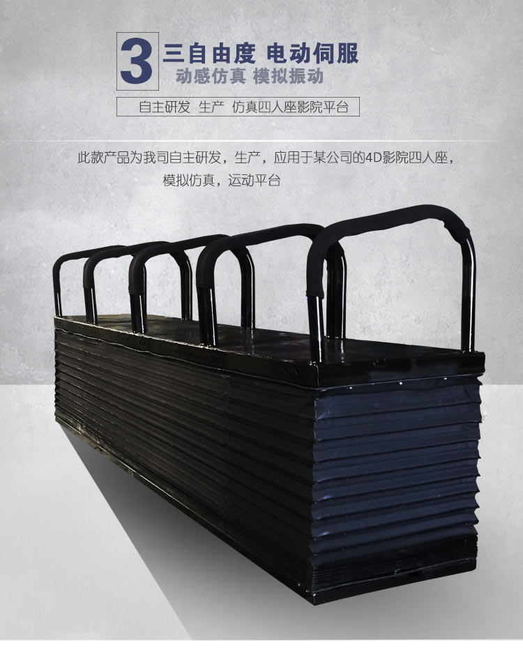 4D動感座椅是建立4D動感影院必不可少的構(gòu)成元素之一,4D動感座椅可以根據(jù)4D動感影院中特效座椅的布置故事情節(jié)的不同而由計(jì)算機(jī)控制做出不同的特技效果來,例如,墜落,震蕩,噴風(fēng),噴雨等等,再配上精心設(shè)計(jì)出來的煙霧、雨、光電、氣泡、氣味等,從而營造一種與影片內(nèi)容相一致的全感知環(huán)境。