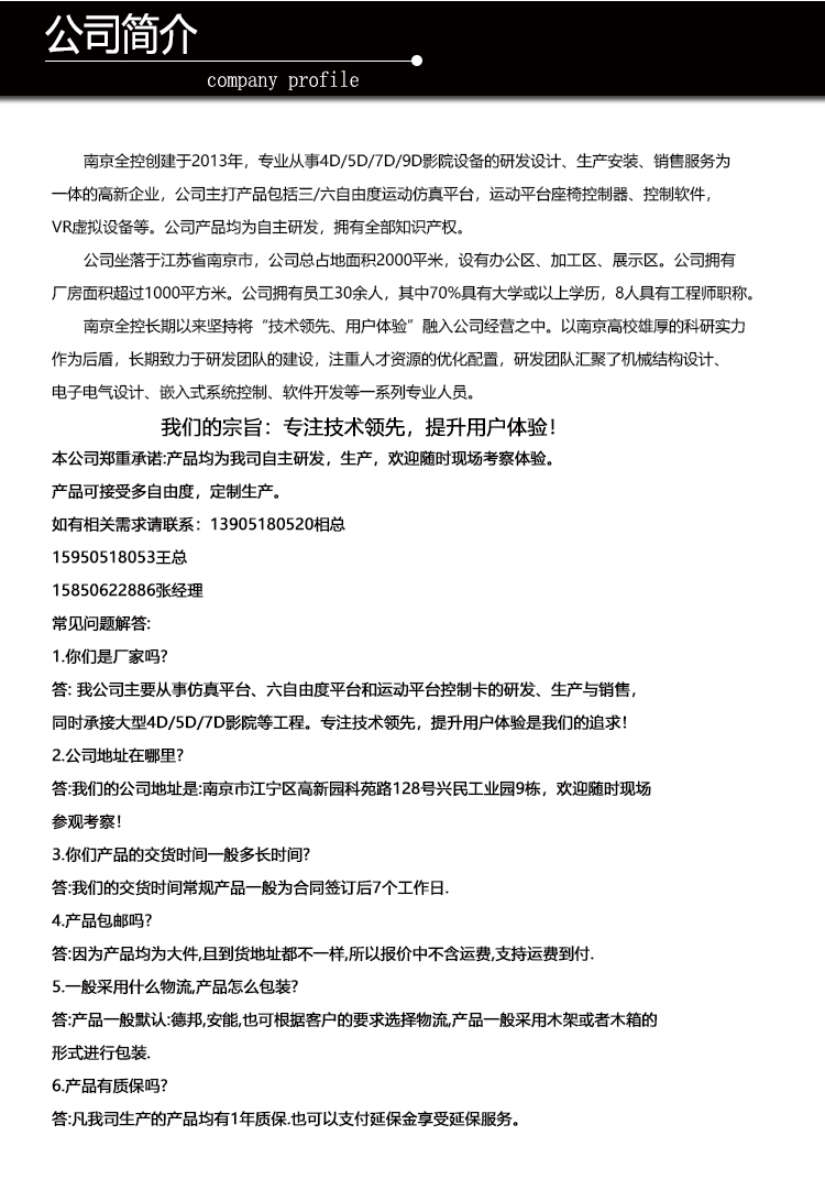 南京全控自主研發(fā)5D影院具有多平臺(tái)實(shí)時(shí)同步、零誤差,電動(dòng)缸具備阻力小,響應(yīng)速度快,與影片同步性高等特點(diǎn),歡迎咨詢了解!