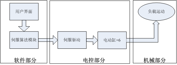 六自由度運動平臺系統(tǒng)由測試軟件部分系統(tǒng)、電氣控制系統(tǒng)、動力電源系統(tǒng)、運動平臺機械本體組成。運動平臺部分的組成結(jié)構(gòu)示意圖如圖3.1所示。