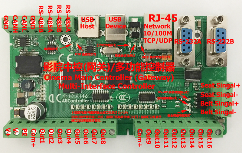 為了協調影院中的各個控制設備或者和院線服務器通訊。我們特此開發了一款多功能端口的控制器,此控制器具備多種功能。
